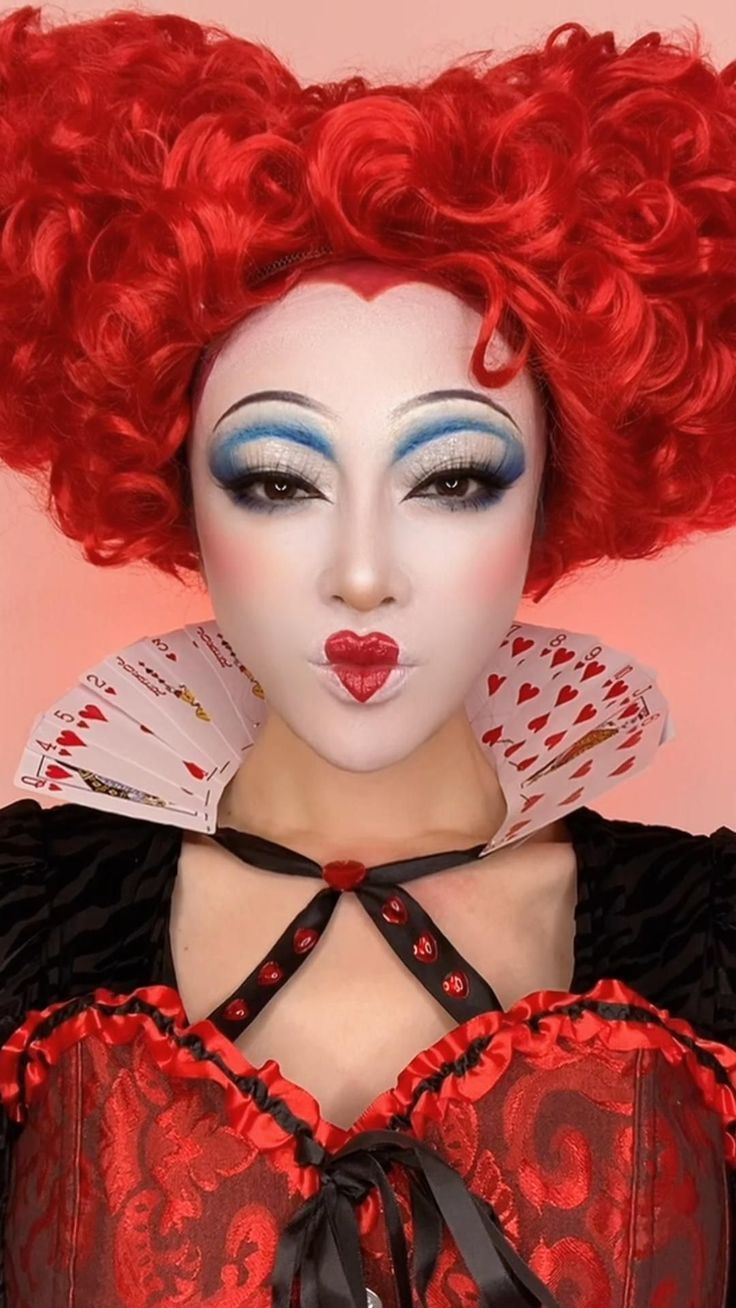 This amazing Queen of Hearts makeup is both regal and whimsical, perfect for making a bold statement at any Halloween event.