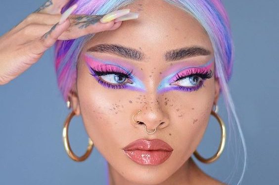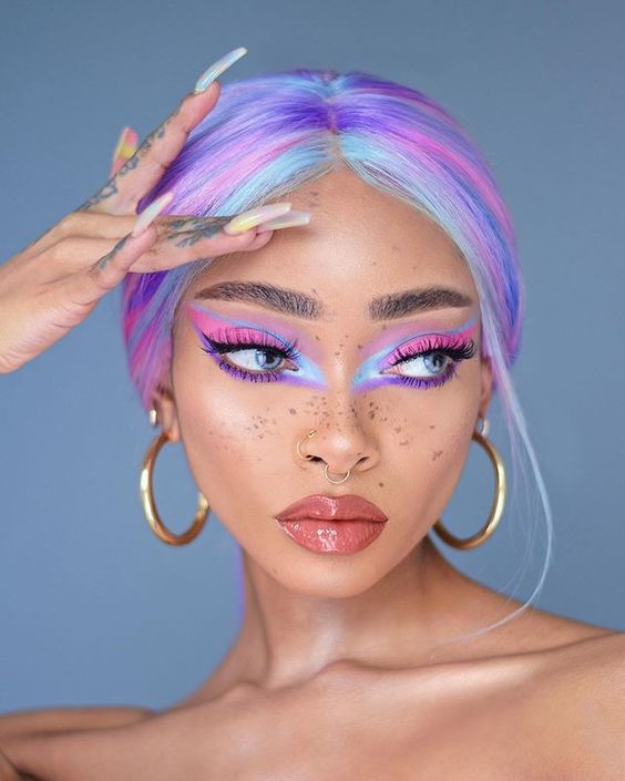 Step into the future with this pretty and vibrant futuristic glam look. The pastel shades and bold eyeliner create a striking, simple yet effective makeup style.