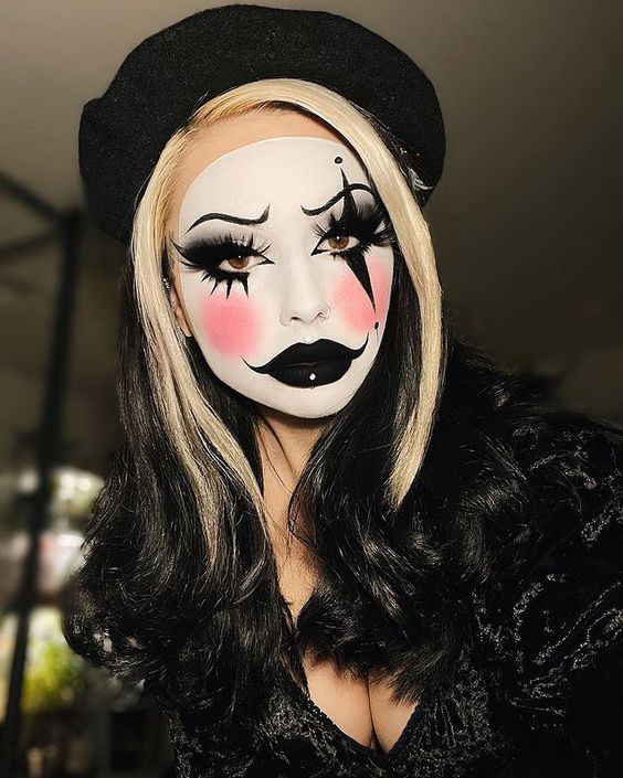 - Pale face with black and white details, emphasizing the eyes and lips.