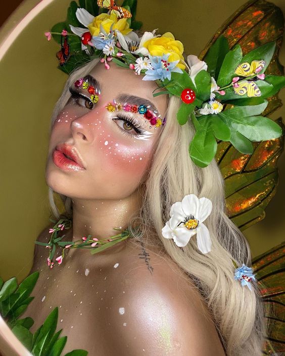 Transform into an enchanted fairy with this pretty and whimsical makeup look. The vibrant colors and intricate details make it a standout choice.