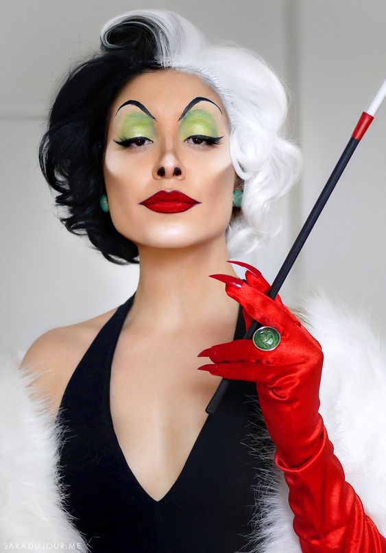 Transform into the epitome of evil elegance with this Cruella de Vil inspired makeup. The bold black and white hair paired with the dramatic makeup makes a pretty yet sinister statement.