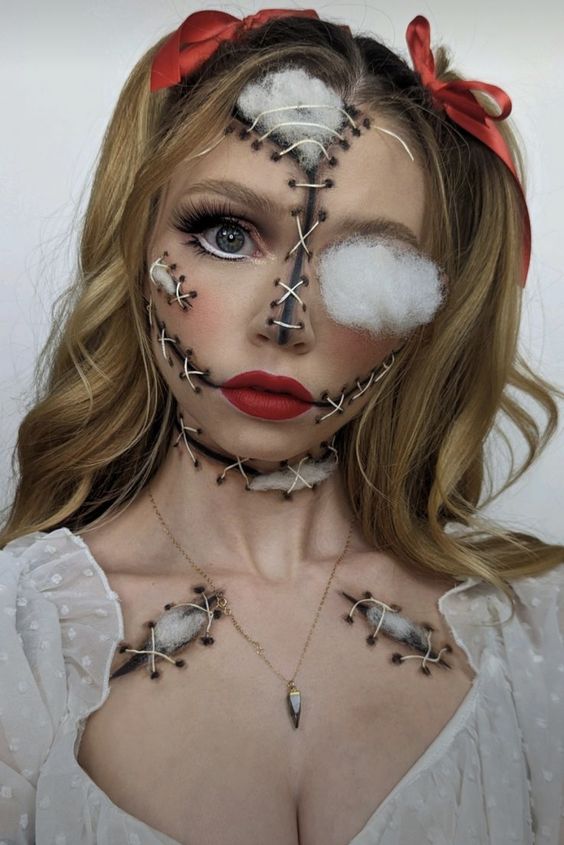 This patchwork doll makeup is both pretty and creative, offering a mix of sweetness and terror with its stitched-up features and delicate details.