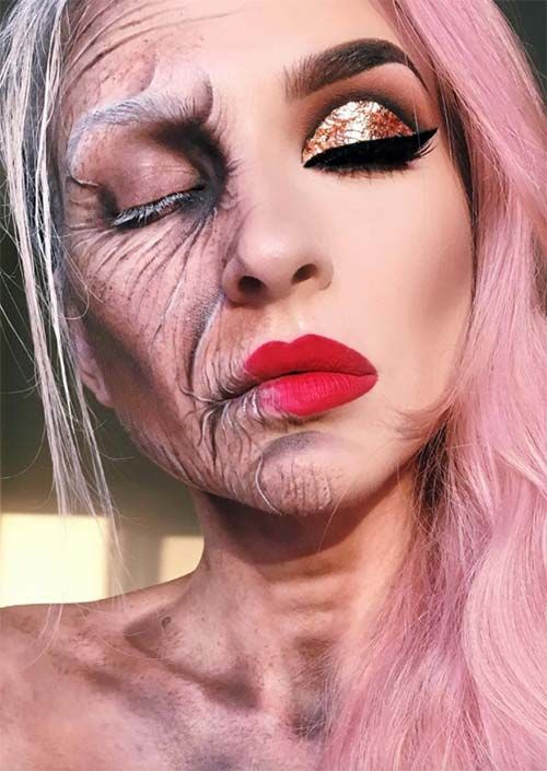 Halloween makeup doesn’t get much more intriguing than this half-glam, half-zombie look. This style perfectly blends beauty and horror, creating a striking contrast that’s sure to turn heads. The glamorous side features shimmering gold eyeshadow, bold eyeliner, and a vibrant red lip, while the zombie side reveals cracked, aged skin, embodying the essence of a chic zombie apocalypse survivor.