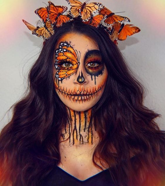 Channel the beauty of monarch butterflies with a haunting twist in this monarch butterfly skeleton queen look. This style combines the elegance of butterflies with the eerie allure of skeletal features, making it perfect for a Halloween costume that’s both pretty and terror-ific.