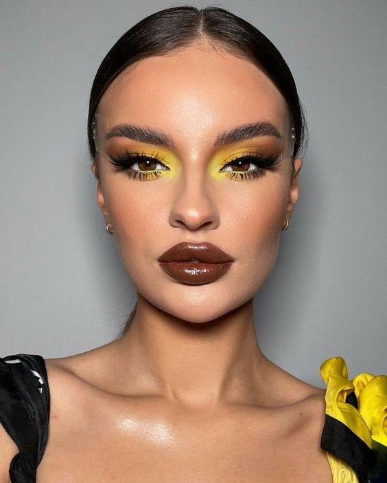 Imagine a bold fusion of vibrant yellow eyeshadow paired with deep brown lips. This look exudes confidence and a fierce sense of style. The striking yellow eyeshadow brings a pop of color to the eyes, making them the focal point, while the rich brown lips add a sophisticated contrast.