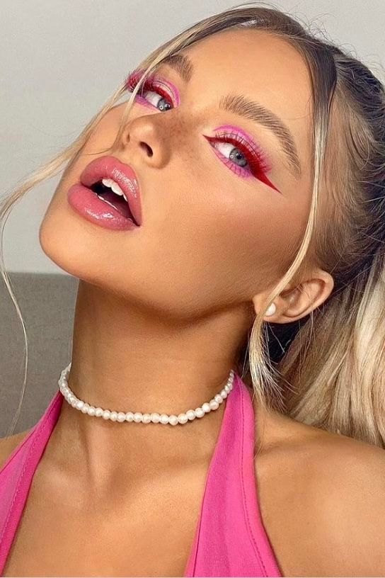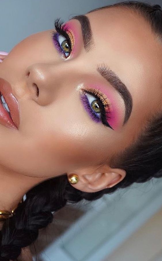 A playful yet edgy look, this neon pink and purple eyeshadow combination is ideal for making a bold statement. The vibrant colors are perfectly blended, creating a seamless transition between shades.