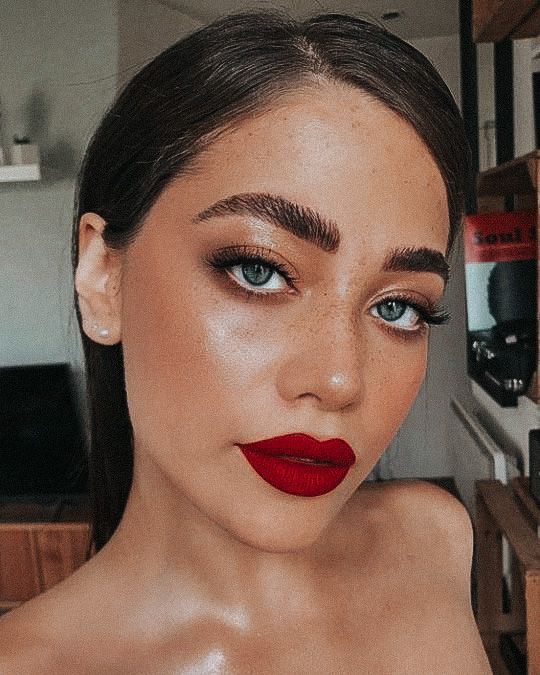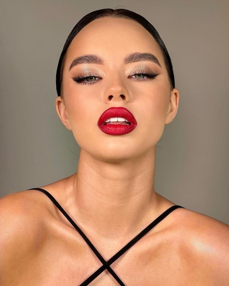 - Lips: Opt for a bold red lipstick with a glossy finish for a modern touch.