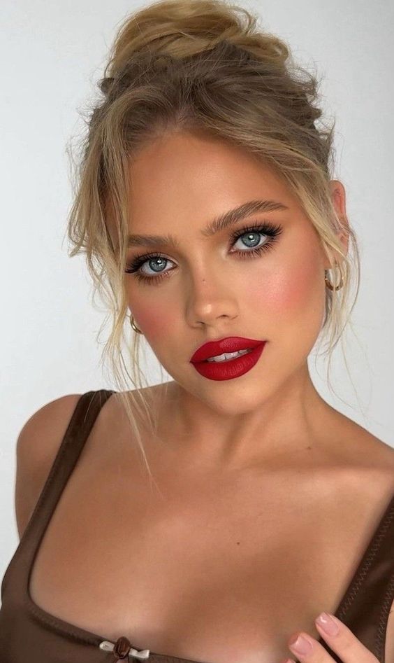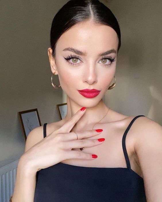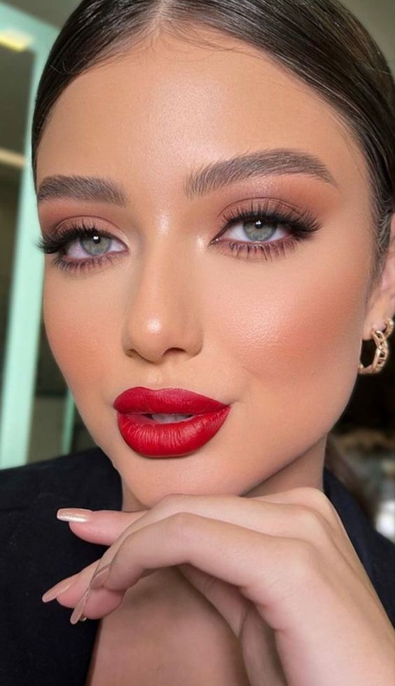 - Lips: Opt for a vibrant red lipstick with a satin finish for a chic look.