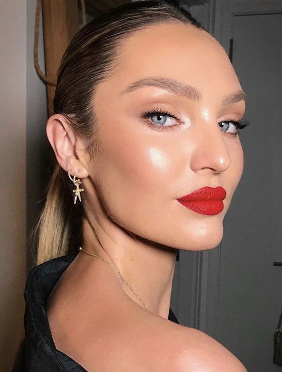 - Lips: Choose a soft red lipstick with a glossy finish for a subtle shine.