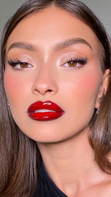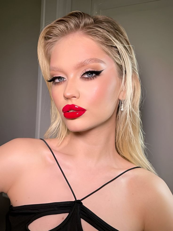 Here, the red lips take on a glossy, almost vinyl-like finish, creating a striking contrast against natural makeup. This look is ideal for those who want to make a statement without going overboard on other makeup elements.