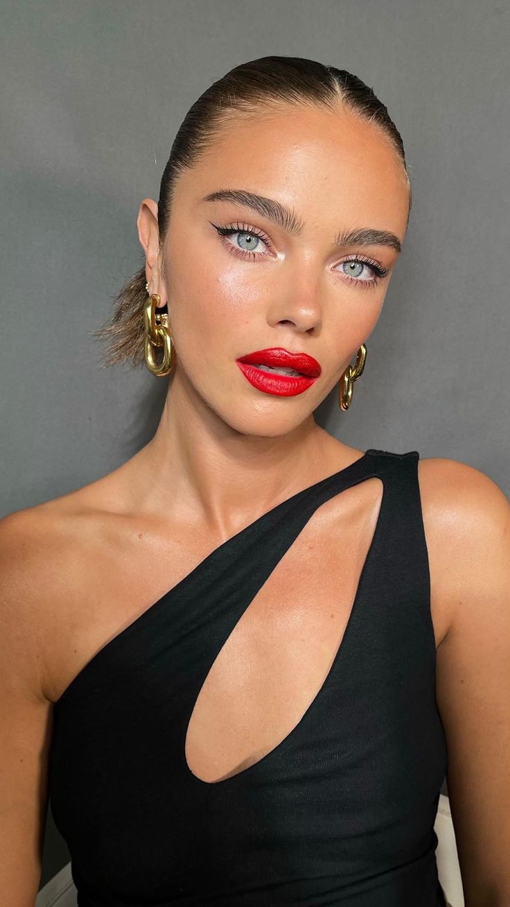 This modern look is perfect for those who want to combine classy and contemporary elements. The bold red lips are paired with minimal eye makeup and a fresh, dewy complexion.