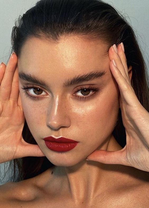 This image embodies the essence of effortless chic with a bold red lip and minimalistic makeup. It’s perfect for those who want to achieve a sophisticated look with minimal effort.