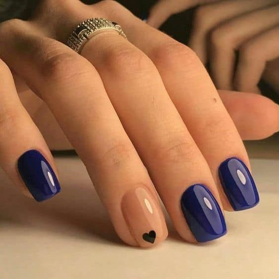This adorable design features a combination of deep blue nails with a single nude accent nail adorned with a tiny black heart. It’s a subtle yet impactful way to add some personality to your manicure.