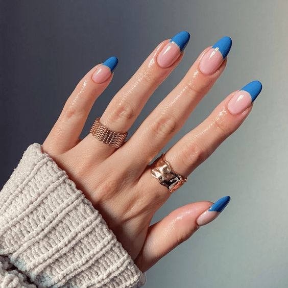- Colors almond: The nude base complements the navy blue tips, creating a harmonious blend.