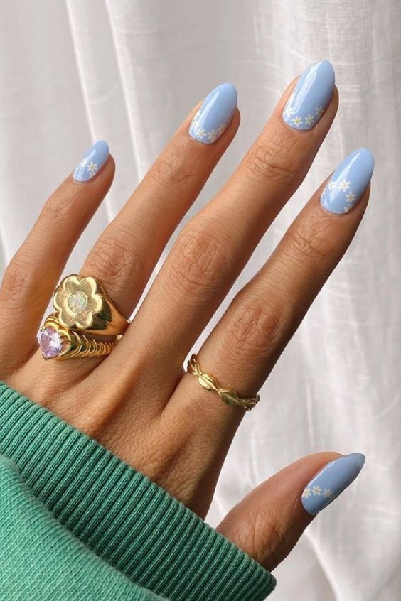 A delicate touch of floral art on a pastel blue base creates a whimsical and feminine look perfect for any fall day.