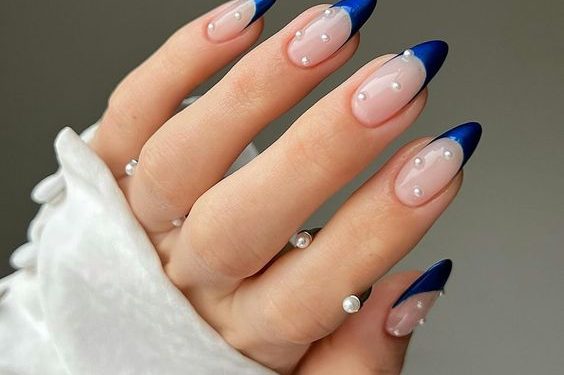 Combining edgy blue tips with delicate pearl accents creates a unique blend of toughness and elegance.