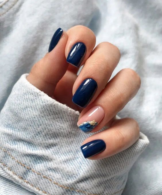 These nails combine a classic navy blue with a touch of creative flair. The accent nail features a unique design that includes a mix of blue shades and a hint of sparkle, making this set perfect for both casual and formal settings.