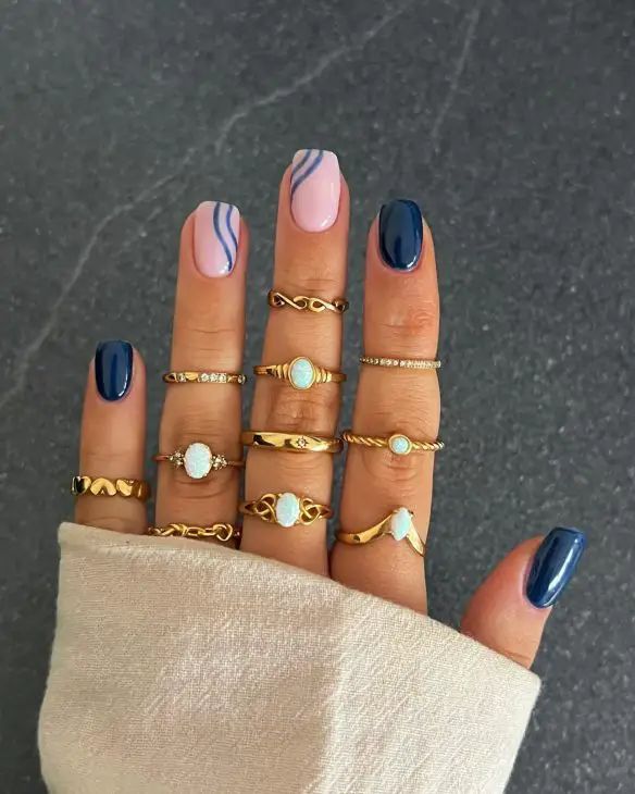 This nail design features a chic mix of navy blue and nude, accented with minimalist art designs. The combination is subtle yet eye-catching, making it suitable for both professional and casual settings.