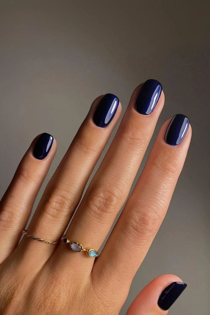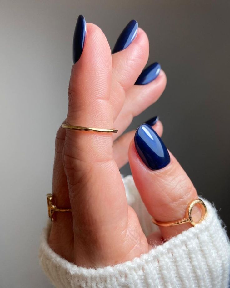 This sophisticated design features a deep, glossy blue color that exudes elegance and class. Paired with gold rings, the nails become a focal point of your ensemble.