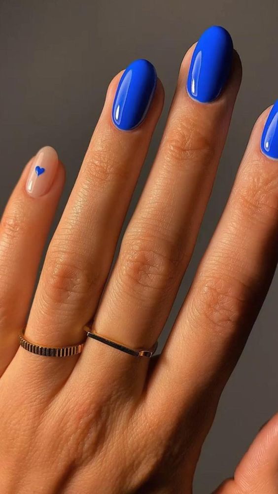 These nails feature a vibrant blue shade that’s both playful and bold. The tiny heart detail on one nail adds a cute and whimsical touch, perfect for those who want to add a bit of fun to their look.