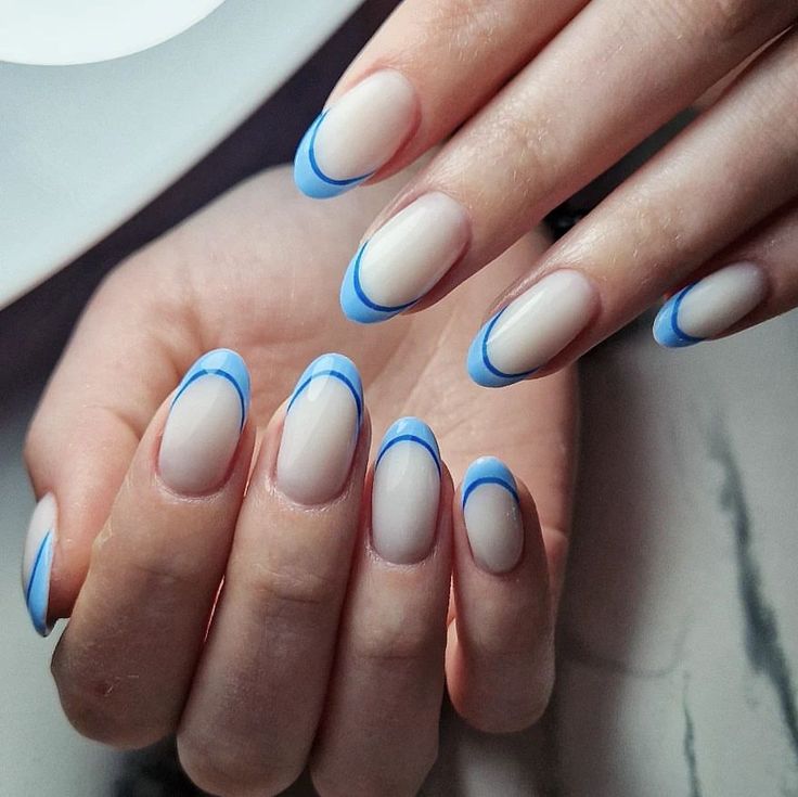 Embrace the classic French manicure with a modern twist. These stunning nails feature a minimalist blue outline on almond-shaped tips, adding a unique flair to the traditional style.