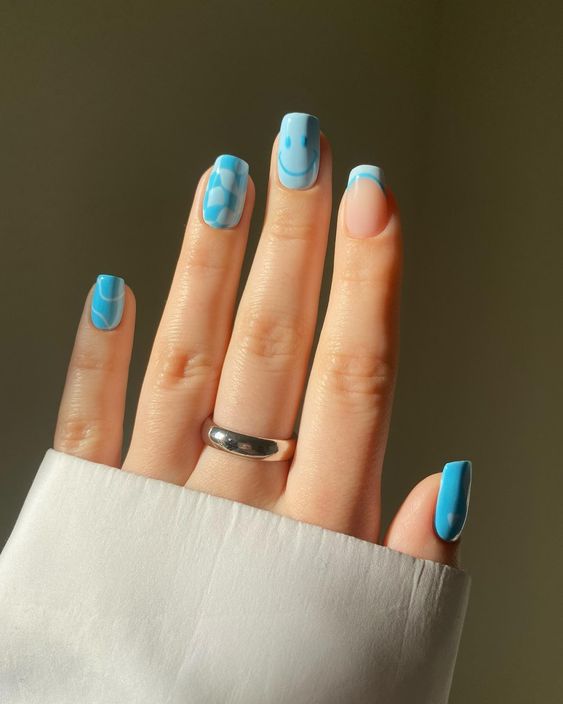 These nails offer a playful mix of blue hues and patterns, creating an eye-catching yet sophisticated look. Each nail features a different design, from solid blue to smiley faces and geometric patterns.