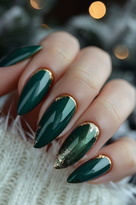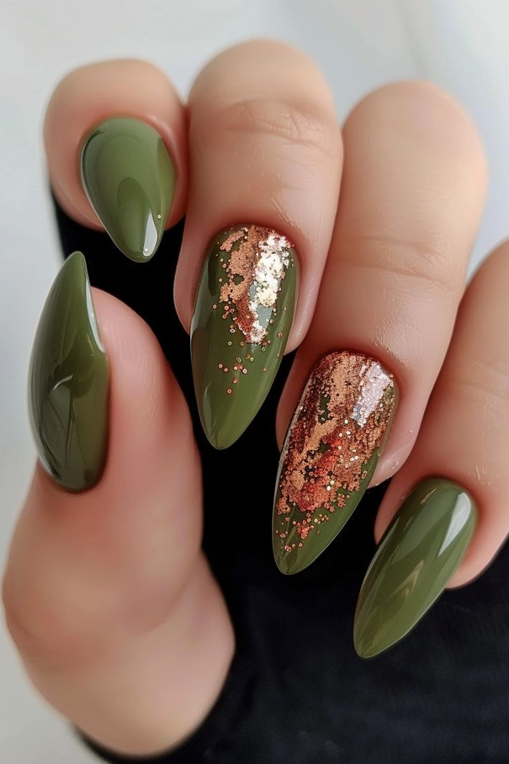 Deep, olive-green nails with a touch of shimmering copper offer a luxurious yet earthy vibe, perfect for winter festivities. The almond-shaped nails add a feminine touch, while the rich green is both trendy and versatile. This look is especially ideal for those who appreciate subtler dark tones without going all-black. Paired with a cozy winter wardrobe, this shade can elevate even the simplest outfits. The copper glitter on accent nails brings in a festive flair, making it appropriate for holiday parties or evening events. Not recommended for more formal settings like business meetings due to its glittery accents.