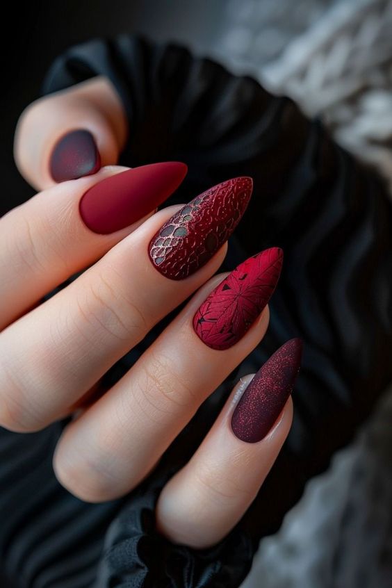 These almond-shaped nails are undeniably striking, blending the richness of matte burgundy with delicate floral lace detailing. This style brings depth and texture, making it perfect for special occasions like winter weddings or holiday parties. The combination of lace with dark hues creates a refined yet bold statement, making the nails a center of attention.