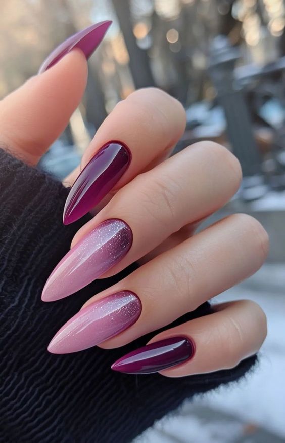 The combination of pink and purple in this ombre effect makes for an eye-catching winter look. The shimmering finish adds a playful touch to an otherwise moody palette, perfect for both casual and formal occasions. The almond shape further enhances the femininity of the design, making it ideal for those who like to keep things a little softer yet bold.
