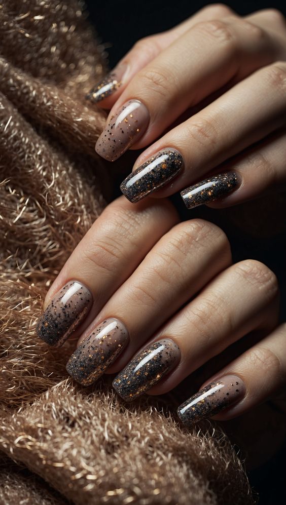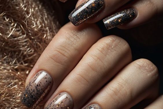 Nothing says glamorous winter quite like a mix of black and gold. This look uses a nude base combined with black and gold glitter for a chic, high-fashion feel. It’s a more subtle nod to dark nail trends while still remaining eye-catching, perfect for those who want a bit of sparkle without going full-on glitter. Ideal for holiday parties or evening events, this manicure feels festive yet sophisticated.