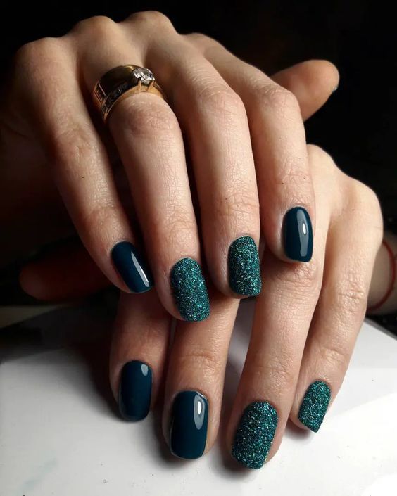 Dark teal nails with a subtle glitter accent are a must for those who want something bold but not too over-the-top. The rich color stands out in winter’s darker palette, and the added glitter provides just enough glam to make this manicure pop. This look works well for a night out or a casual get-together. The deep teal is reminiscent of winter landscapes, making it a unique yet season-appropriate choice.