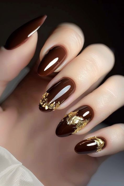 Warm, rich chocolate brown nails are an unexpected but delightful choice for winter. The gold accents on two nails add a festive, luxurious touch without overwhelming the overall look. This color is perfect for those who prefer neutral tones but still want to feel glamorous during the colder months.
