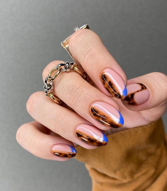 This stunning nail design features a classic tortoiseshell pattern with an unexpected twist – a sharp, vibrant blue tip. This look is perfect for those who want to merge traditional elegance with a pop of modern color.