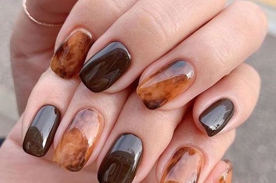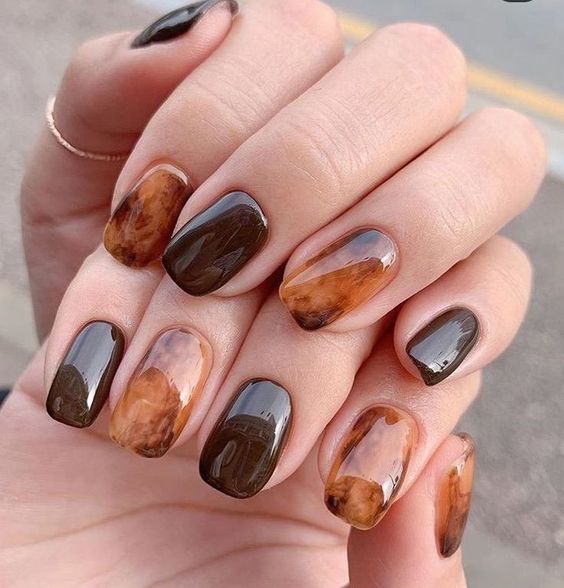 Next, we have a design that incorporates earthy tones and a marbling effect. This look is perfect for those who love natural shades and want something versatile yet stylish.