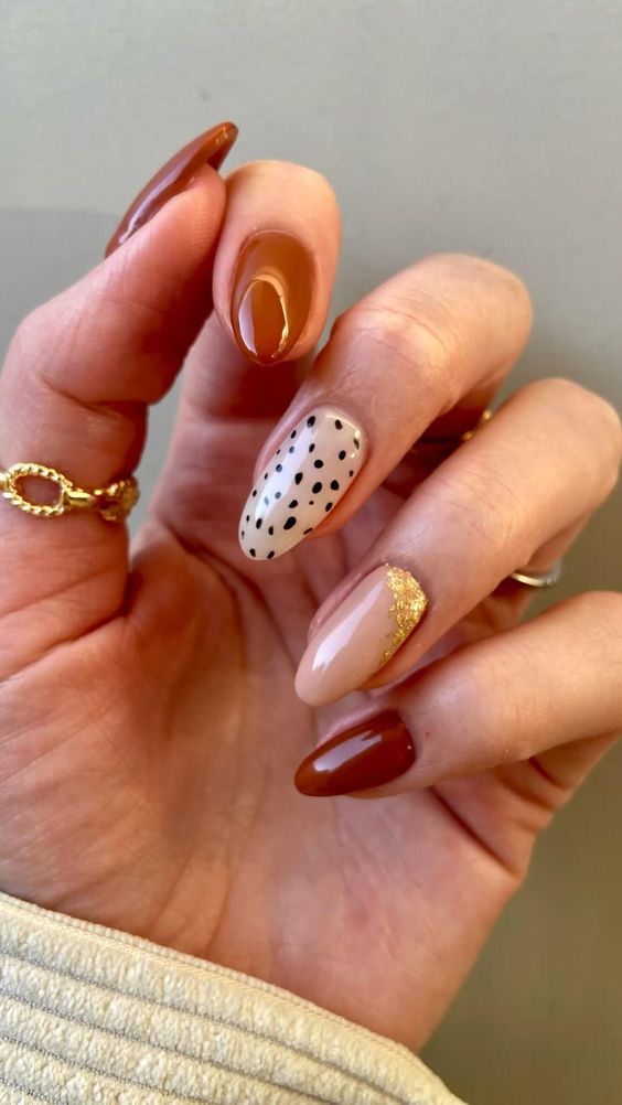 This design is all about mixing patterns and warm tones, perfect for those who love a bit of variety on their nails. It combines different shades of brown with unique patterns on each nail.