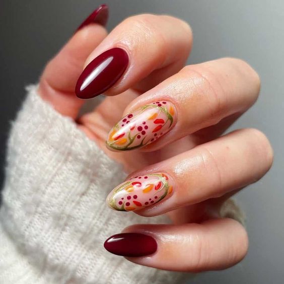 This design combines a classic burgundy with intricate floral detailing, perfect for those who appreciate both elegance and creativity in their nail art.