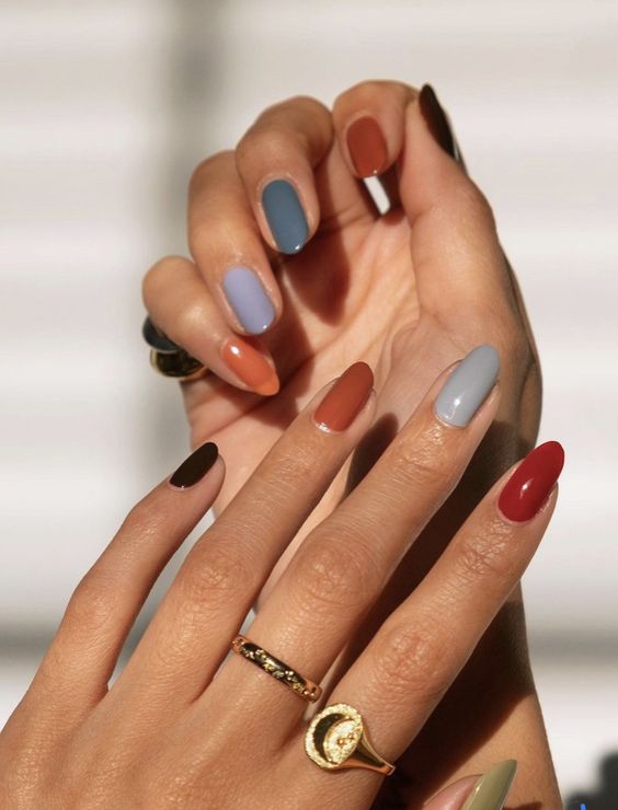 Celebrate the beauty of autumn with this multi-colored nail design featuring shades of brown, red, and blue. It’s a versatile and trendy look that captures the essence of the season.