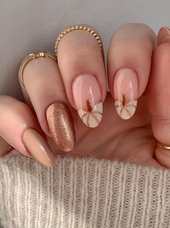 These short dip nails combine elegance with a subtle festive touch. The soft nude base is perfect for everyday wear, while the gold accents bring a hint of glamour, making them ideal for fall festivities.