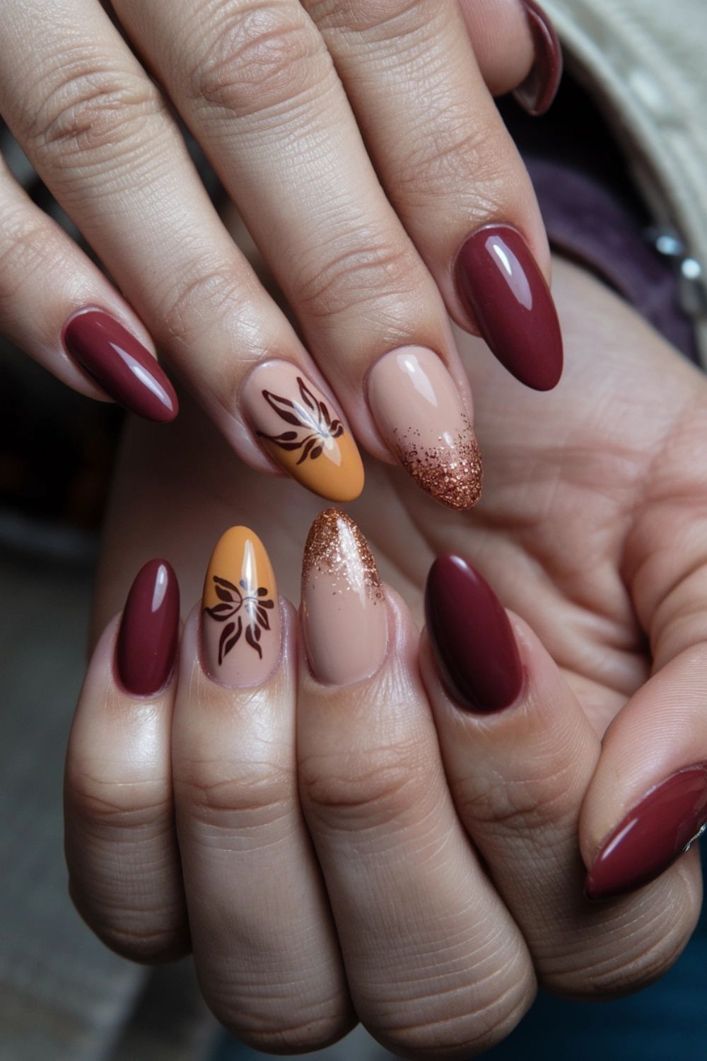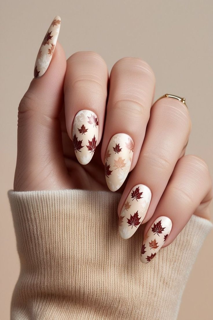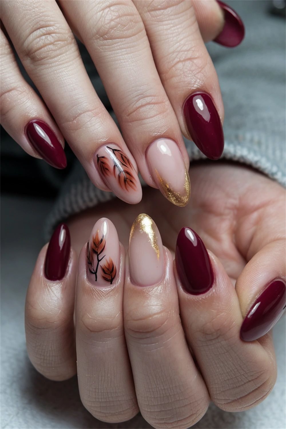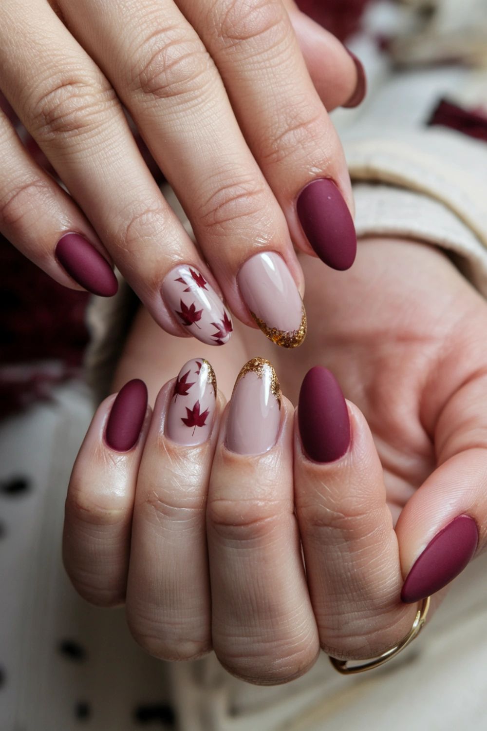 Let’s finish with a bolder twist. This plum matte and glossy nude combo delivers designs autumn with an elegant edge. Gold foil tips and scattered maple motifs create contrast that feels both festive and high-fashion.