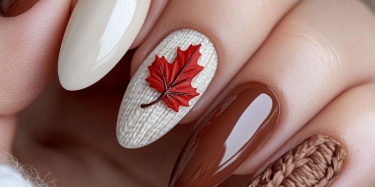 The middle nail features a white base with a vivid maple leaf — perfectly hand drawn