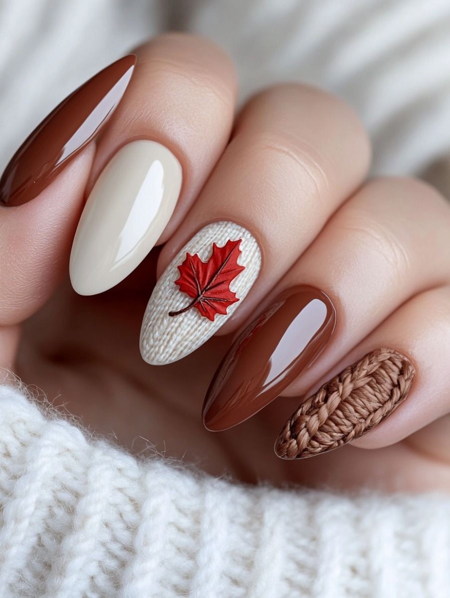 Each nail is different: one knit, one leaf, one solid neutral, one glossy almond
