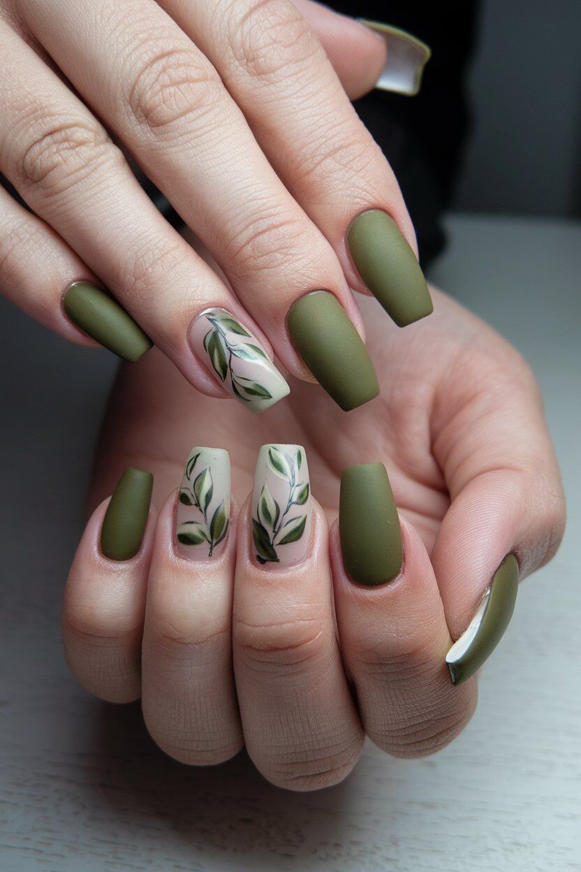 This matte olive green set brings the forest floor to your fingertips. What I love most is the simple serenity of it all—no glitz, just grounding. Two accent nails feature hand drawn branches with soft green leaves, giving a painterly, romantic edge to an otherwise minimalist set. These nails feel like a meditation, ideal for transitional wardrobes and quiet autumn days.