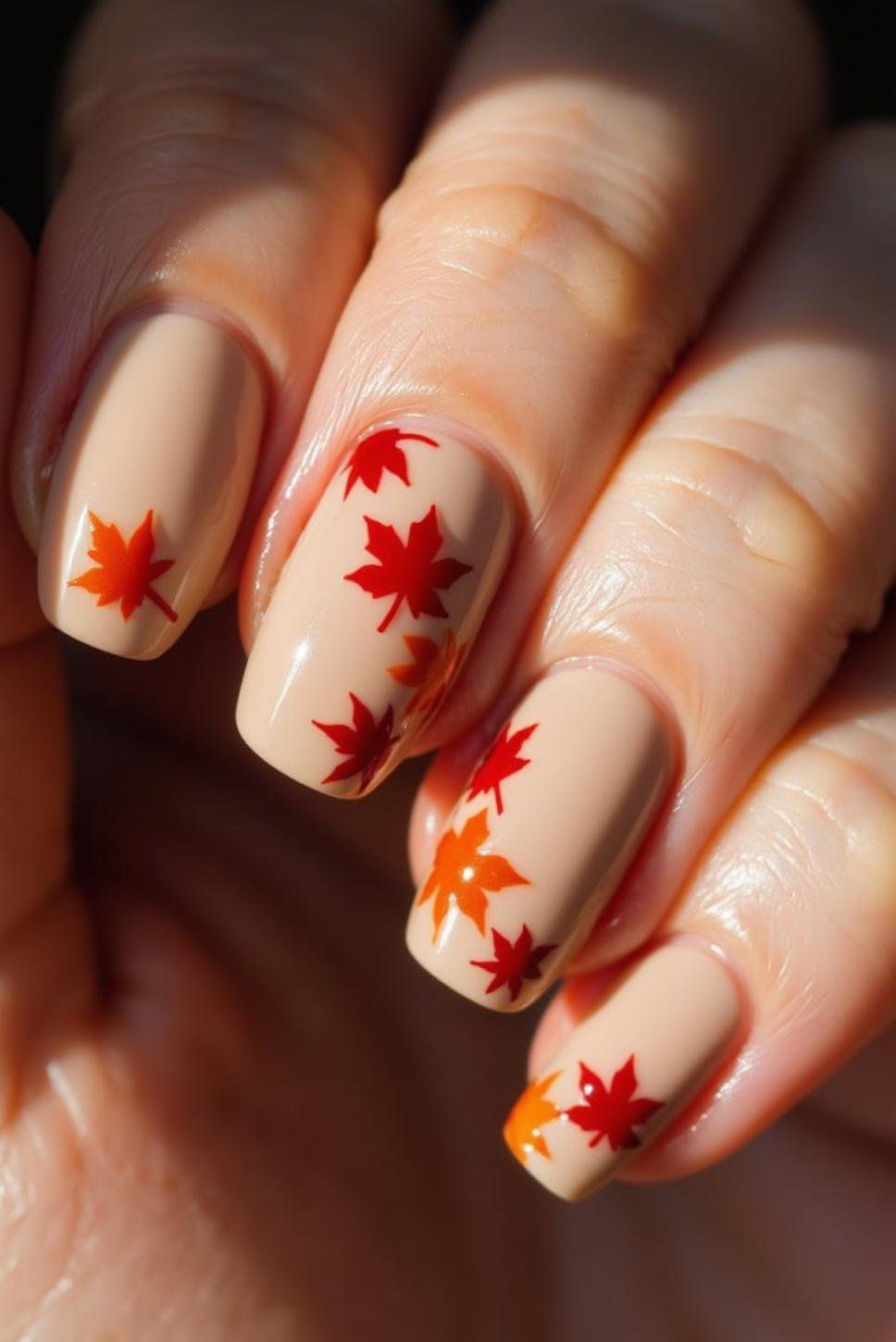 This manicure feels like walking under a tree just as the wind shakes loose a flurry of red and orange leaves. The warm nude base acts as the perfect neutral canvas for autumn leaves scattered in vibrant hues of red and amber. The placement of each leaf feels spontaneous, like natural art, giving the nails a soft storytelling vibe. It’s the kind of set that transitions seamlessly from office days to cozy café weekends.