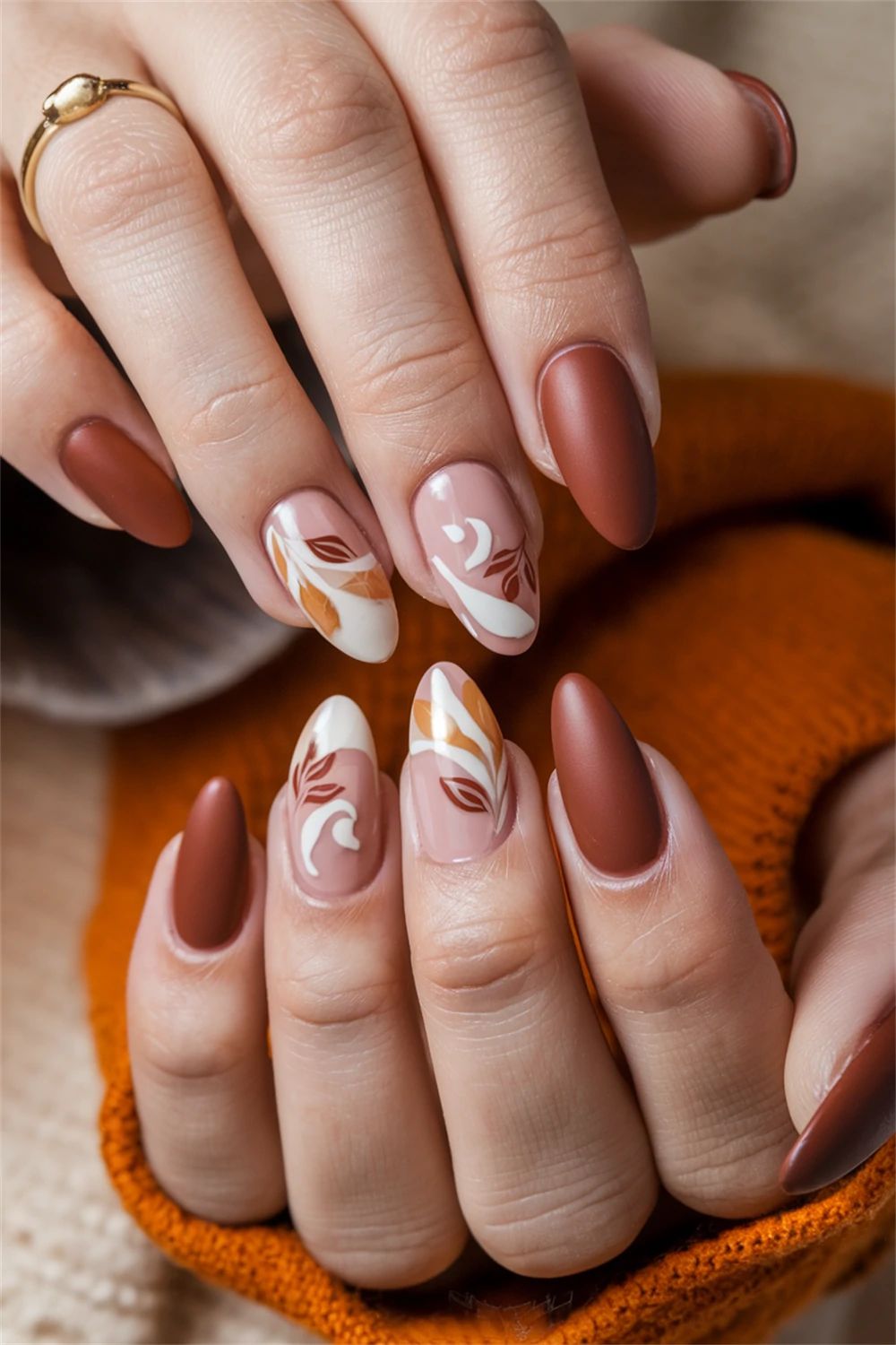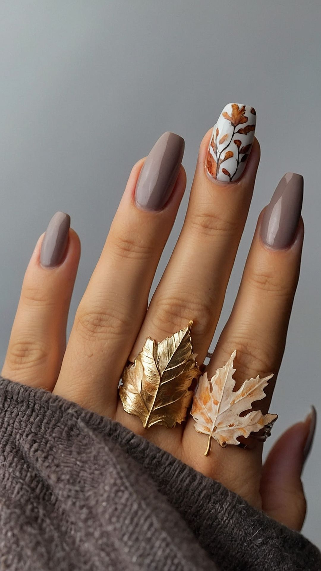 Two accent nails feature hand-painted brown leaves — minimal yet poetic