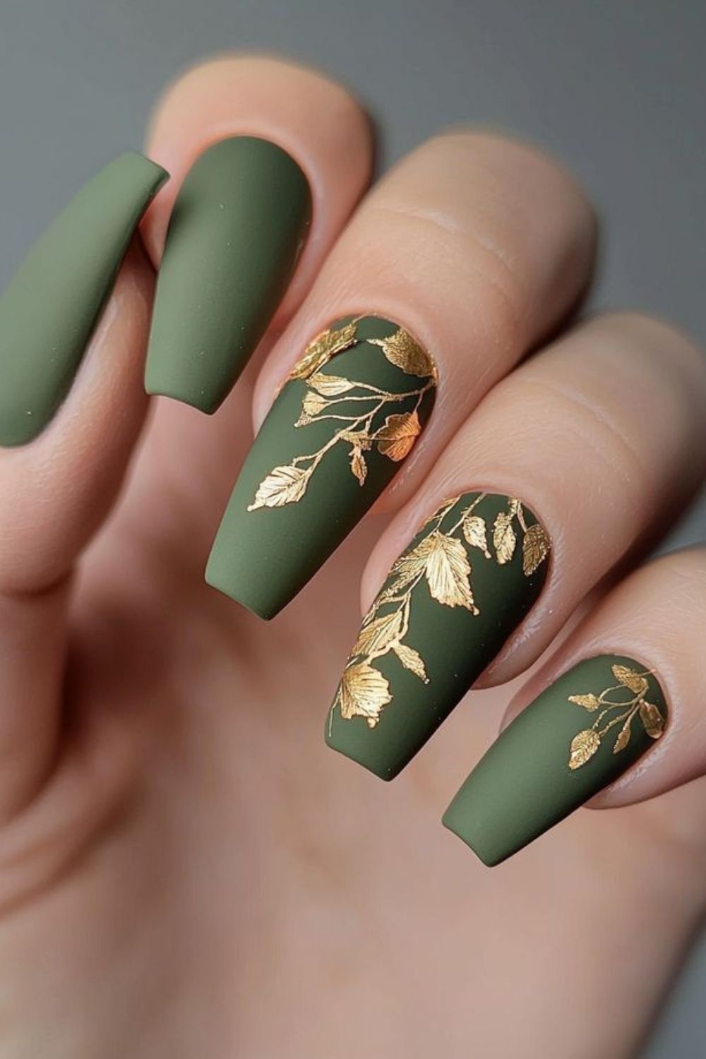 Matte olive with gilded leaf detailing? Yes, please. This set is autumn royalty. Each nail is a canvas of rich, earthy green, with gold foil art designs delicately pressed in to mimic delicate twigs and autumn leaves. The long, coffin shape enhances the regal aesthetic, and the overall effect is bold but beautifully balanced. It’s perfect for fashion-forward settings—a fall wedding, editorial shoot, or luxe event.