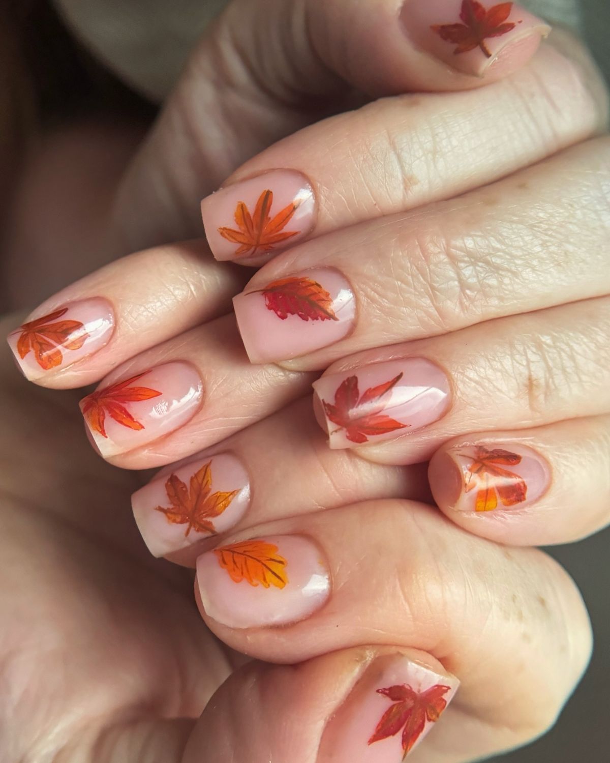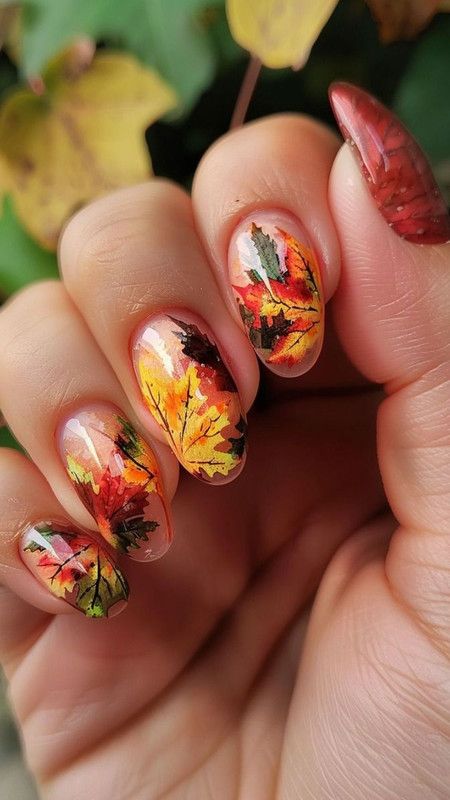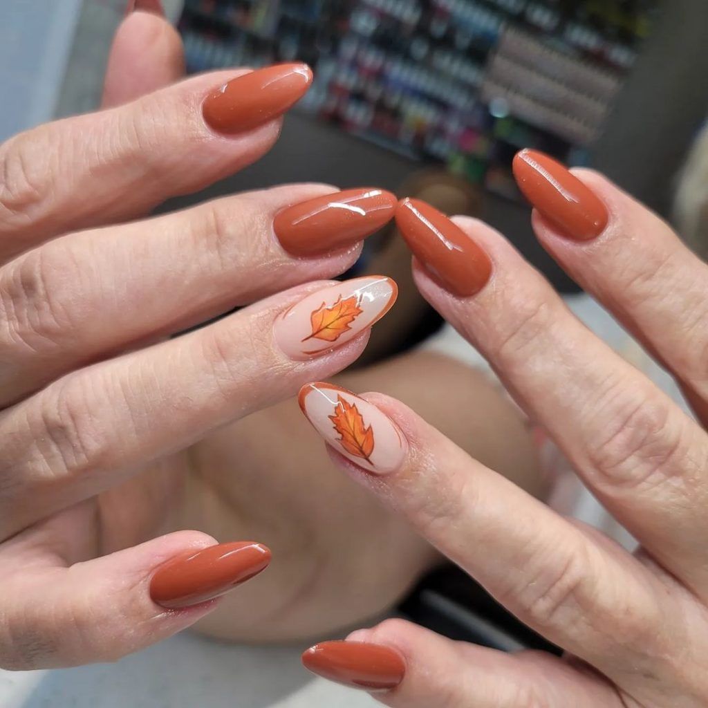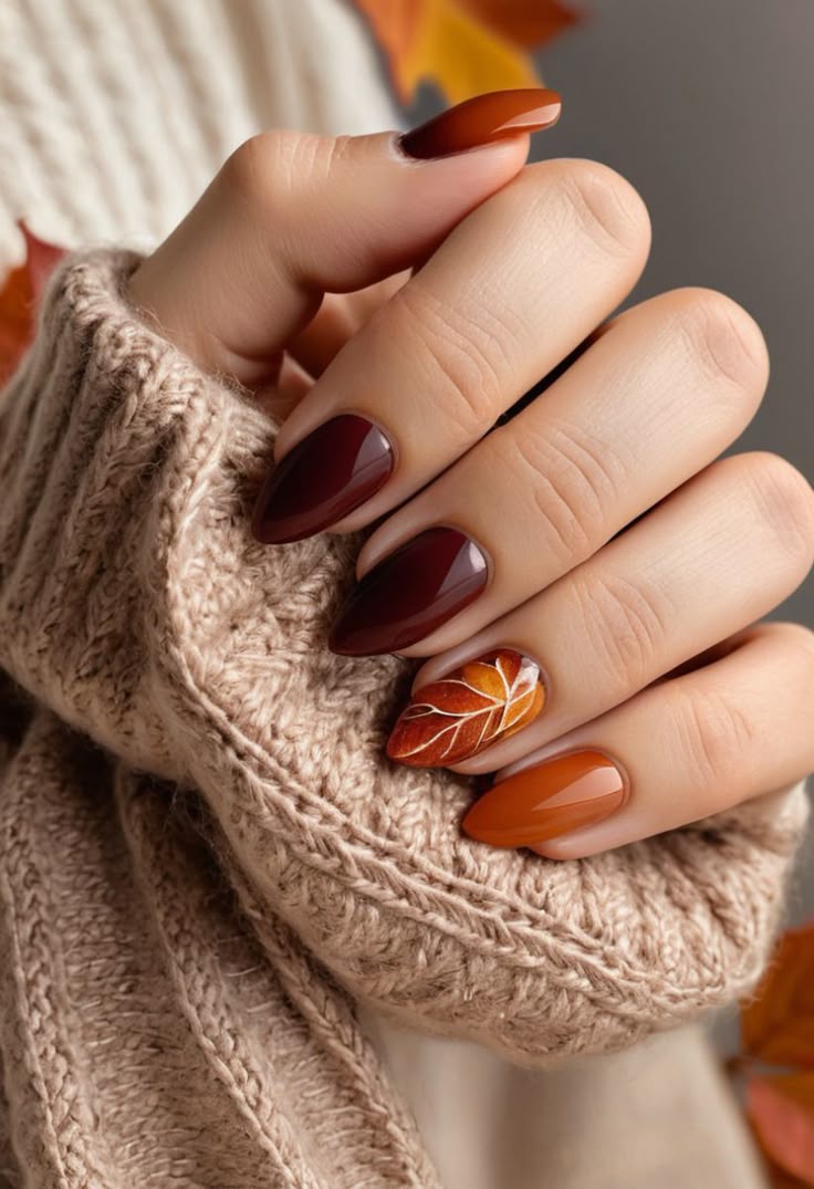 The accent nail features a single, highly detailed leaf in orange and ochre tones