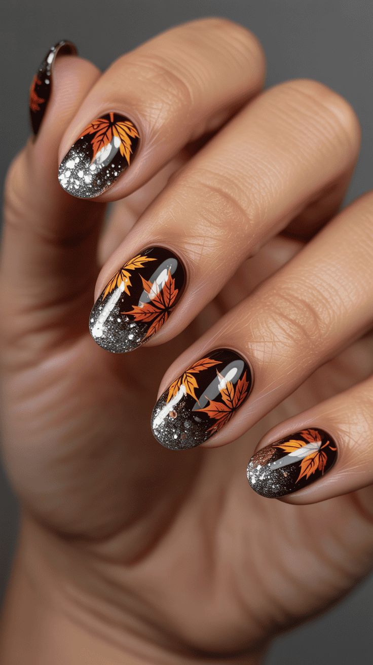 Now this is fall drama done right. A glossy black-to-silver ombré serves as the backdrop for bold red and orange autumn leaves, making it one of the most striking art designs in the entire roundup. It’s equal parts moody and magical, like a harvest moon rising after sunset. With the added sparkle, this look leans dressy—think holiday parties, October weddings, or even Halloween chic.