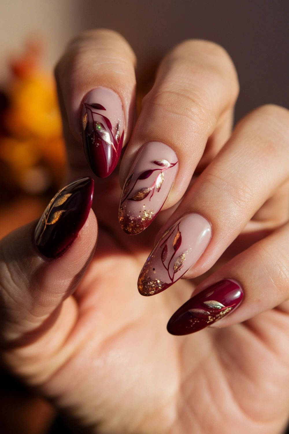There’s something incredibly cinematic about the clash between deep red wine gloss and soft nude transparency. Here, the look is elevated with golden accents and delicate hand drawn leaves, making the entire set feel like a love letter to October evenings and golden hour selfies.