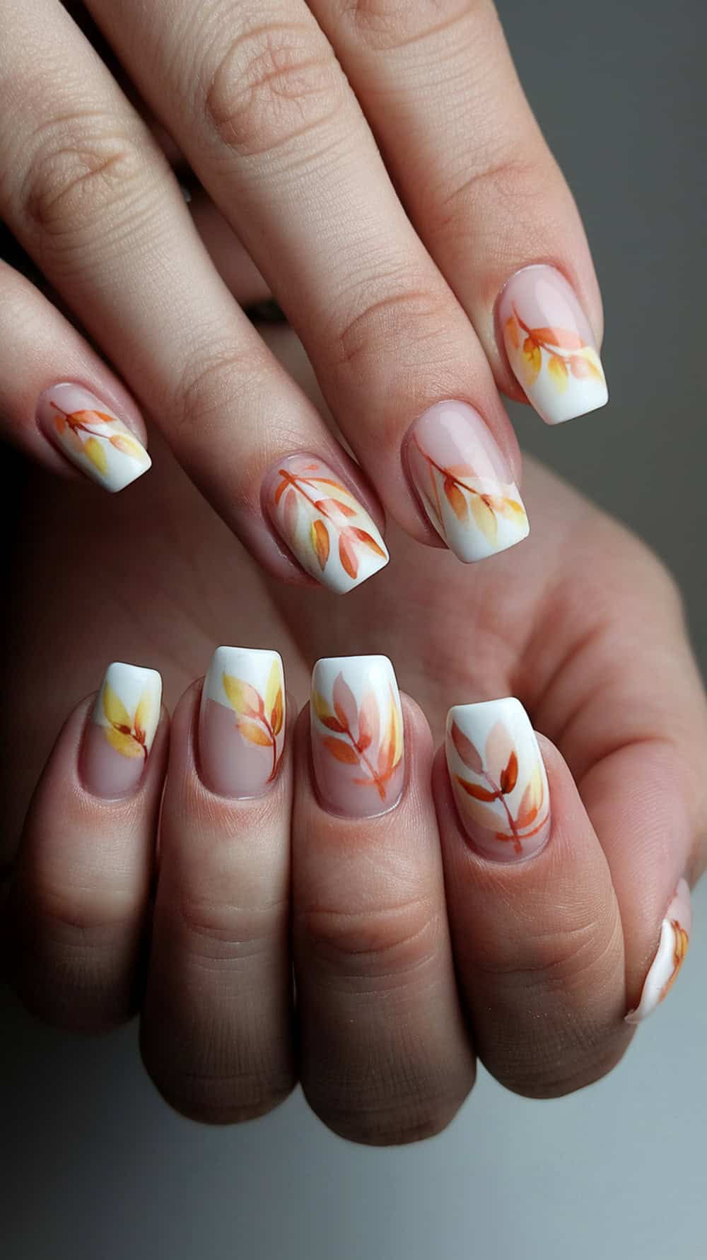 Soft, serene, and easy to wear, this manicure is the epitome of gentle fall flair. It’s all about subtle transitions—peachy orange melts into warm yellow, all outlined by white French tips. The leaf shapes are hand drawn in watercolor style, creating an effect that feels painted by breeze and light. Short square shapes make this ideal for daily wear or work-from-home chic.