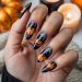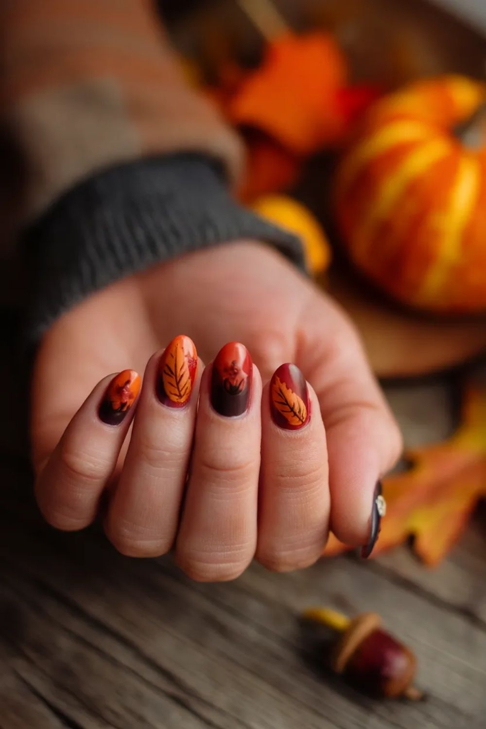 Warm, festive, and just a little whimsical, this look blends deep fall colors—burnt orange, blackened burgundy, ochre—with crisp autumn leaves and a pumpkin accent that almost winks. The gradient across the nails from dark to bright creates energy, like walking from shadows into sun. This look works beautifully for Halloween-adjacent events, orchard visits, or cozy weekends with flannel and cider.